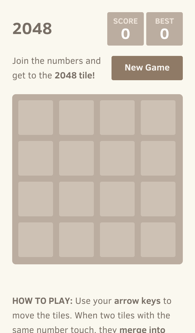 How to play: test Use your arrow keys to move the tiles. When two tiles with the same number touch, they merge into one!